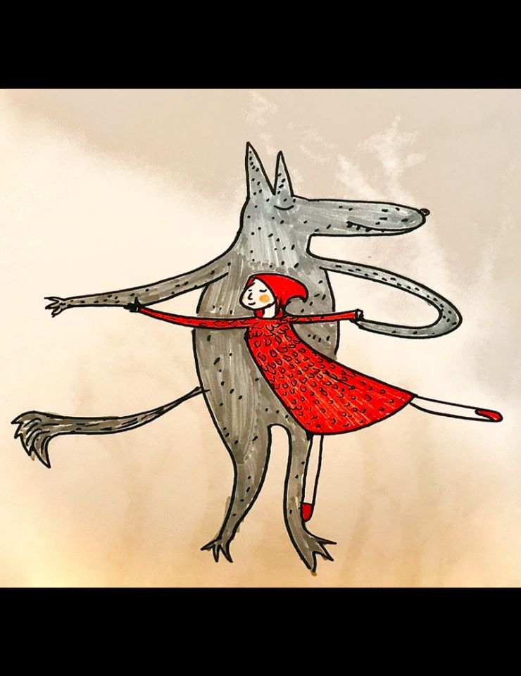 “Mamã, avó, floresta, bolo.” A palavra dita, narrada a partir de um livro que se abre, sugere o poder transformador do cenário em imaginário. “Cuidado, lobo, perigoso.” A narradora-mãe adverte o desconhecido. E a Capuchinho-bailarina, em seu singular percurso, dança ao luar com o lobo mentiroso, na floresta que também é a casa da avó de boca tão grande que afinal era o lobo, que não era assim tão mau mas que tinha fome. O caçador ouve o grito e não mata, mas salva. A moral é apaziguadora.