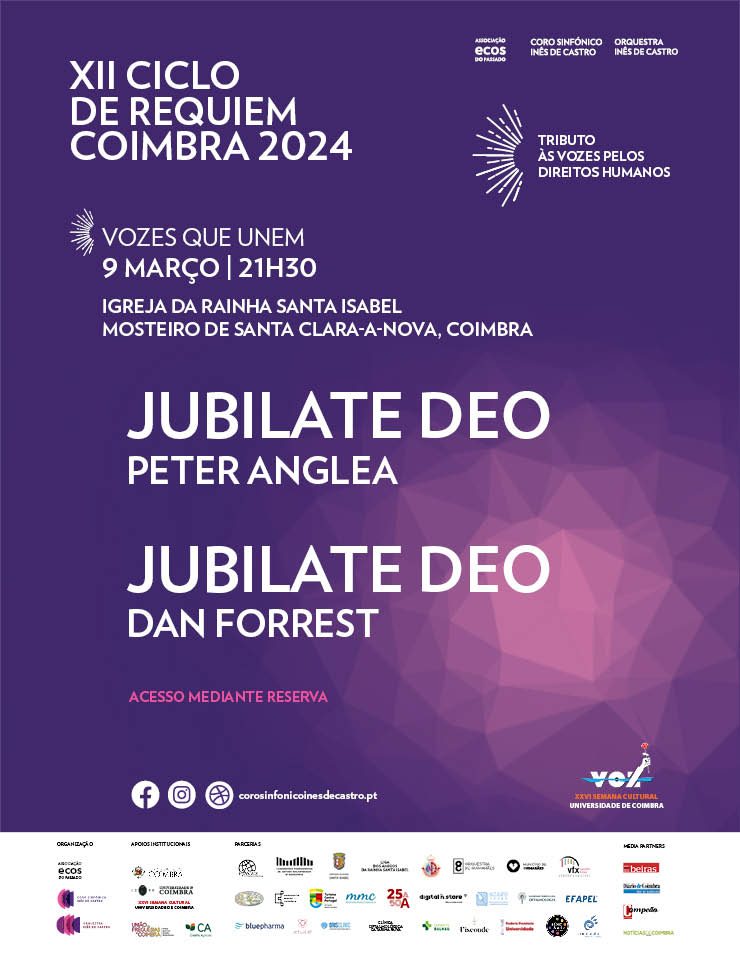 As duas obras Jubilate Deo, de Peter Anglea e Dan Forrest, cantadas em seis línguas, têm tudo para resultar num momento marcante, primeiramente sob a Direção do Maestro James Libbey (LU) e depois sob a Direção do Maestro Artur Pinho Maria (PT). Com a união do Coro Sinfónico Inês de Castro ao grande coro luxemburguês Voices International, mais de 130 vozes prometem uma experiência musical verdadeiramente excecional, numa atmosfera de júbilo ao Artigo 1º da Carta Universal dos Direitos Humanos - “Todos os seres Humanos nascem livres e iguais em dignidade e em direitos. Dotados de razão e de consciência, devem agir uns para com os outros em espírito de fraternidade”.