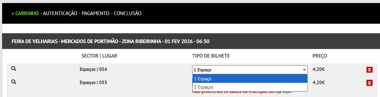 Para obter o desconto 2 Espaços deve, após adicionar os dois lugares ao carrinho, selecionar a opção 2 Espaços no Tipo Bilhete: